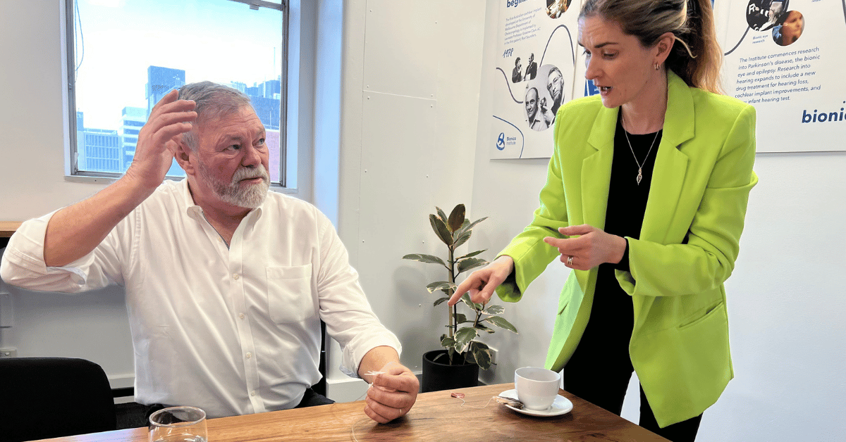 A/Prof Sophie Payne shows Neil Balme the vagus nerve stimulation device